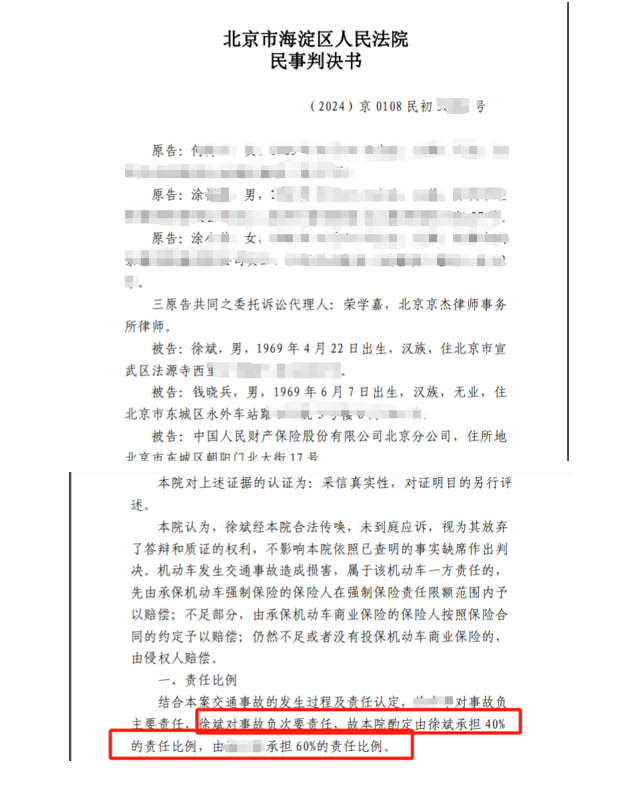 2023年9月,在北京市海淀区,涂先生因在骑行过程中不慎偏离非机动车道,被后方正常驶来的徐某驾驶的小轿车刮蹭,当场倒地头部受到重创,昏迷不醒,生命垂危,送至医院抢救,形成植物人状态。事发后10天,在多家律所中,涂先生的直系亲属坚定的选择委托了京杰律所。律师通过了解,发现在事故的责任认定方面情况对我方很不利。律师多次跟随当事人去事故发生现场查勘,拍摄道路情况,寻找事故分责突破点。事故责任最终认定为主次责任,我方承担主要责任。后在诉讼的过程中,涂先生于事发一年后不治身亡。律师及时告知家属如何留证,及时与法官取得联系、催促开庭、变更诉请、变更原告主体、拟代理意见等,并在诉讼请求中坚持主张让对方按照40%来承担赔偿责任,并积极举证,检索类案。最终我方全部诉求被支持,精神损害抚慰金不参与分责,满额赔付!家属献上锦旗表达感谢。