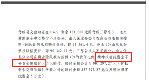 在司法实践中,通常主次责任的赔偿比例是按照30%与70%来划分,本案改变了常见的法律习惯,支持了由次要责任方承担40%的赔偿比例,并且精神损害抚慰金不参与到分责当中。为本案当事人多争取了近20万赔偿。