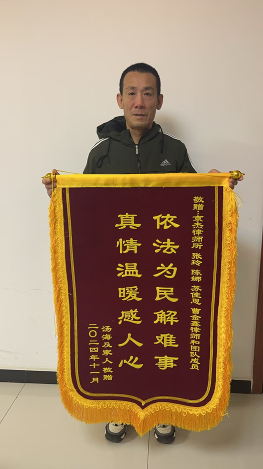 2023年12月,汤某与王某、李某在北京市通州区发生交通事故,事故造成汤某受伤。受伤后家属当即委托京杰,全权处理本次事故。律所也第一时间组成专案组指导伤者准备案件所需证据材料,考虑到伤者伤情严重以及想尽快拿到赔偿款,在伤者身体符合评残条件时,律师立马与保险公司协商,共同选择双方认可的,有资质的鉴定机构全面查体,最终争取到一处八级伤残、一处十级伤残!之后京杰律师与保险公司多次沟通协商,最终为伤者拿到共97余万赔偿款并争取到伤者后续治疗可以继续理赔的权利!案件结束后,当事人对案件结果非常满意,特送锦旗表达对律师的感谢!