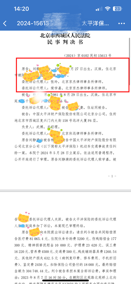 2023年8月,在北京市朝阳区,当事人刘某与杨某发生交通事故,刘某无责。当事人经过2个月的选择与考虑,慎重选择委托了京杰律所。当事人的髋部骨折,作为未婚未育的年轻女孩,当事人在律师的建议下选择诉讼保障自身权益,避免后遗症遗留问题无法得到全面处理。律师尽职尽责为每一项主张提供全面证据支持,一遍遍不惮其烦地指导当事人配合提供。最终判决下发,金额全部支持,且精神损害抚慰金10级伤残支持10000元,被告承担全部诉讼费。当事人对结果非常惊喜,主动送上锦旗以表感谢。