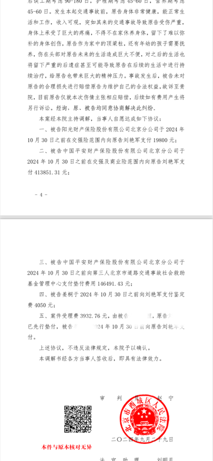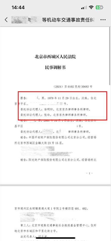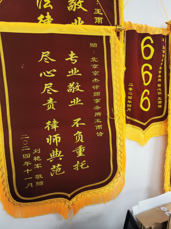 2023年7月,在北京市昌平区,当事人刘某在篮球场内打篮球时被违规行驶的摩托车撞倒,刘某无责。刘某头部受创,昏迷不醒,送至医院便进入ICU当即进行了开颅手术抢救,住院治疗长达一月有余。在多家律所中,最终选择委托了京杰律所。律师通过分析伤情,与法医沟通,为当事人争取到了双十级的伤残鉴定结果,并在诉讼过程中成功与保险公司达成调解,调解金额与主张金额基本一致。在法院的主持下,顺利拿到赔偿款。当事人送锦旗表达感谢。
