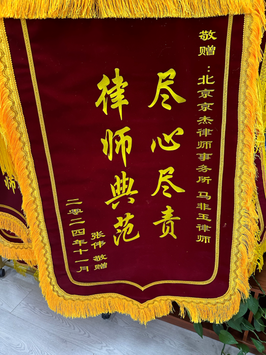 2024年4月,在北京市东城区,当事人张某骑电动自行车外出工作期间与轿车驾驶人郝某发生交通事故,张某主责、郝某次责。京杰律所的律师接受委托后考虑当事人的工作情况、受伤部分、治疗方案等需要,为了减轻当事人的负累,与保险公司沟通进行共同委托鉴定,最终鉴定结果为十级伤残,考虑到当事人需要二次手术,经过多次与保险公司的沟通,终保险公司认可先赔付当事人尚未进行的二次手术费用,当事人拿到了合理的满意的赔偿款,当事人献上锦旗以表感谢。