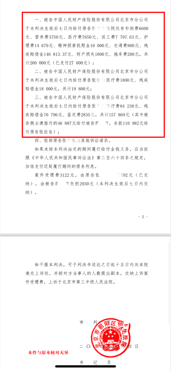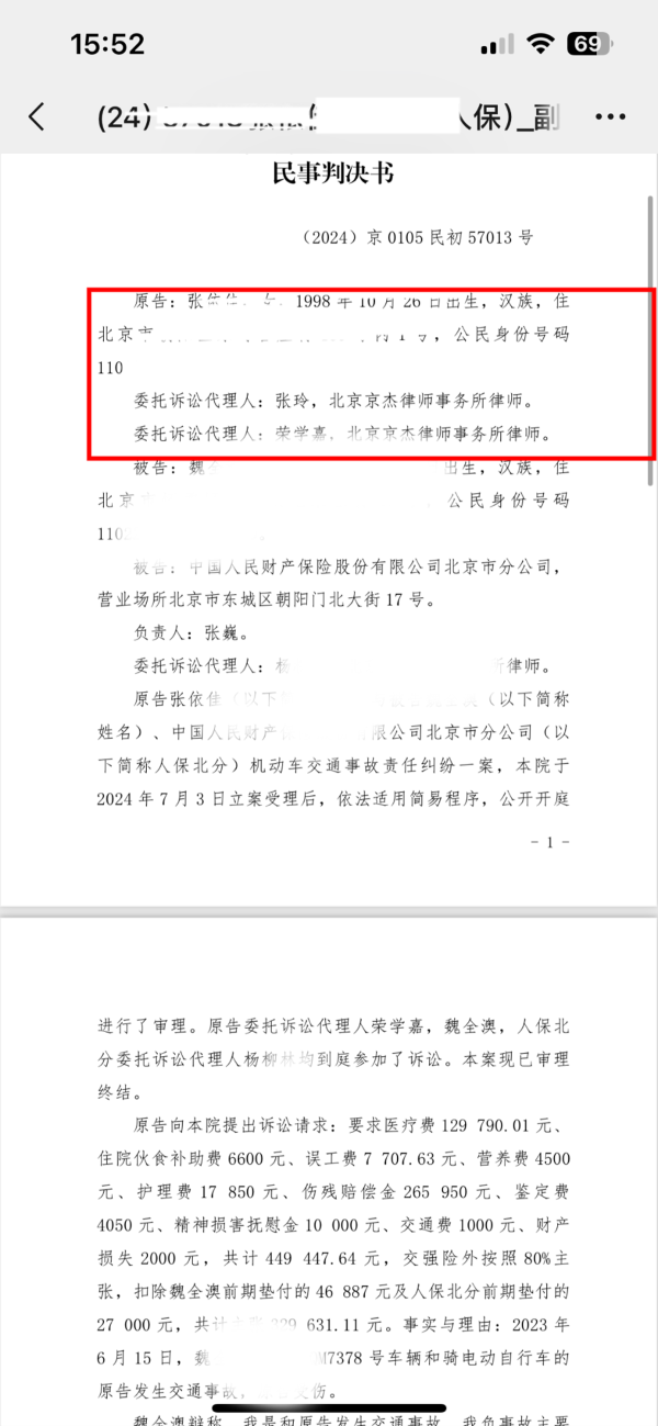 2023年6月15日,突如其来的交通事故导致年仅24的张某头部受伤,当事人的母亲心急如焚之时,在此经朋友介绍及时委托了京杰律所,京杰律所第一时间成立专案组,经过专案组分析,考虑到头部受伤,为了保障当事人的最大权益及后遗症保障选择了诉讼。前期经过我们的步步指导,第一时间留存了有利证据,出院时积极与医院沟通病情及文书书写,后期更是为当事人,选择最适合受害人的鉴定机构,在受害人恢复良好的情况下,为受害人争取了两个伤残10级的鉴定结果,最终历时一年零3个月,判决下发,法官依据我们提交整理的证据裁量,判决基本完全认可我方主张,共计支持37万余元,为此当事人制作大尺寸锦旗由衷感谢京杰团队所有办案人员。